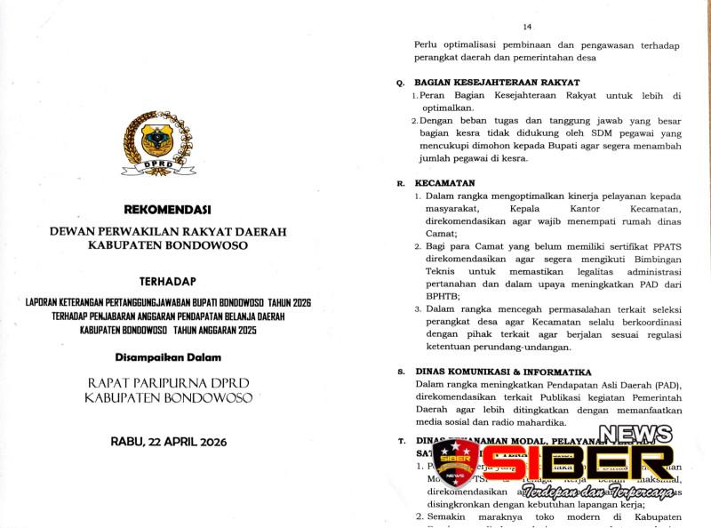 BONDOWOSO, SIBERNEWS.CO.ID – Rapat Paripurna pembahasan LKPJ Bupati di DPRD Kabupaten Bondowoso, Rabu (22/4/2026), melahirkan rekomendasi khusus bagi jajaran kecamatan. Legislatif menekankan tiga hal krusial yakni kewajiban menempati rumah dinas, kelengkapan sertifikat PPATS, dan ketertiban seleksi perangkat desa.