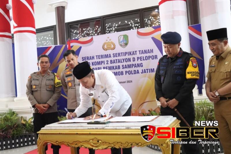 SAMPANG, SIBERNEWS.CO.ID – Komandan Satuan Brimob Polda Jatim Kombes Suryo Sudarmadi S.IK, MH mewakili Korps Brimob Polri dan Polda Jawa Timur mengucapkan terima kasih kepada Bupati Sampang H. Slamet Junaidi beserta jajarannya atas pemberian hibah tanah kepada Kepolisian Negara Republik Indonesia.