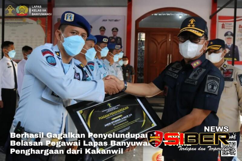 Banyuwangi,SIBERNEWS.CO.ID_Sebanyak 14 orang pegawai Lapas Banyuwangi yang beberapa waktu lalu berhasil menggagallkan upaya penyelundupan narkoba memperoleh penghargaan dari Kakanwil Kemenkumham Jatim Zaeroji. Penyerahan penghargaan dilakukan pada apel bersama sore ini (16/9/2022).