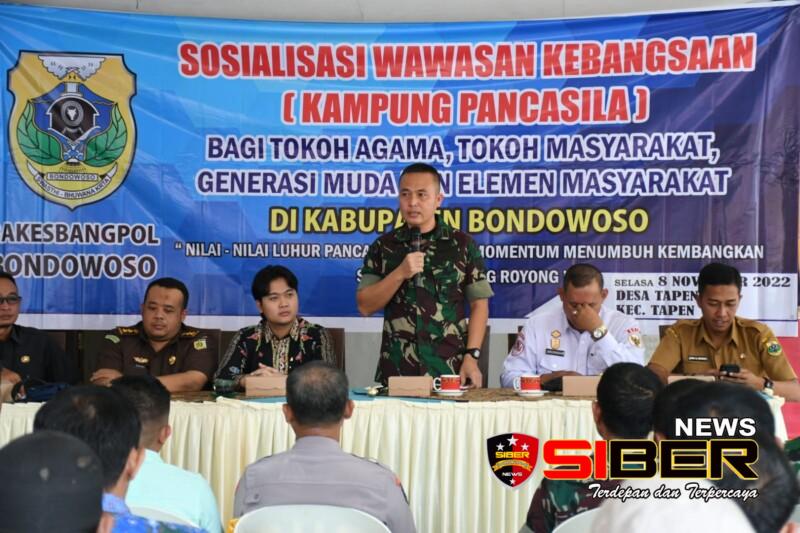 Bondowoso, SIBERNEWS.CO.ID _ Komandan Distrik Militer (Dandim) 0822/Bondowoso Letkol Arm Suhendra Chipta, M.Tr.Hanla., hari ini hadir di Balai Desa Tapen Jl. Raya Situbondo Ds. Krajan Kec. Tapen Kab. Bondowoso guna memberikan penguatan dan pembinaan dengan menanamkan nilai–nilai wawasan kebangsaan bagi warga binaan kepada Tokoh Agama, Tokoh Masyarakat, Generasi Muda dan Elemen Masyarakat dengan tema “Nilai – Nilai Luhur Pancasila sebagai Momentum Menumbuhkan Semangat Gotong Royong”, Selasa (8/11/2022).
