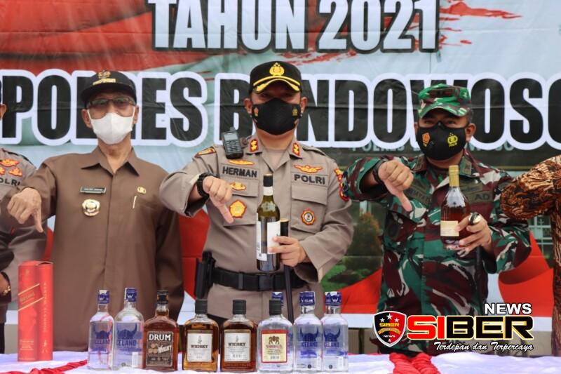 BONDOWOSO,SIBERNEWS.CO.ID – Forum koordinasi pimpinan daerah Bondowoso turut memusnahkan barang bukti selama tahun 2021 di Mapolres Bondowoso, Kamis (22/12/2021).