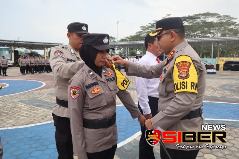 Tampak Kapolres Lampung Selatan AKBP Yusriandi Yusrin memasangkan ban lengan dan memakaikan rompi Polisi RW di hadapan peserta upacara yang juga dihadiri pejabat Forkopimda Lampung Selatan.