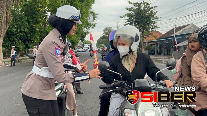BANYUWANGI, SIBERNEWS.CO.ID- Dalam rangka memperingati Hari Jadi ke-77 Polisi Wanita (Polwan) Republik Indonesia, seluruh Polwan dari Polresta Banyuwangi menggelar kegiatan simpatik dengan membagikan coklat dan bendera kepada para pengguna jalan di Simpang Empat Patung Kuda, Banyuwangi, pada Rabu (27/8/2025).