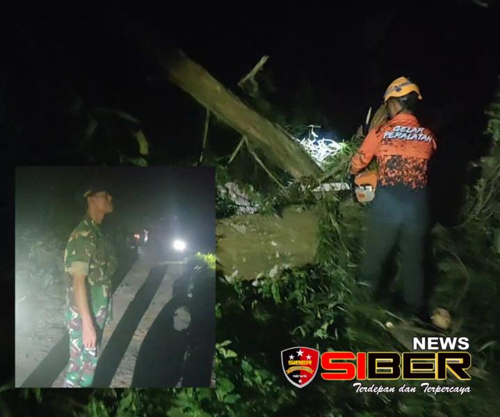 Sertu Slamet Sadikun bersama BPBD Kabupaten Bondowoso turut serta membantu dan memotong kayu yang menghalangi jalan umum.