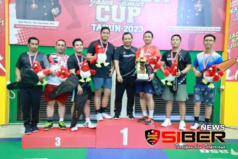 Kapolda Jatim Irjen Pol Dr Toni Harmanto, secara simbolis memberikan piala serta medali kepada Kapolres Bondowoso dan Kasubbag Dumasan Itwasda, yang keluar sebagai pemenang pada Badminton Kapolda Cup 2023.