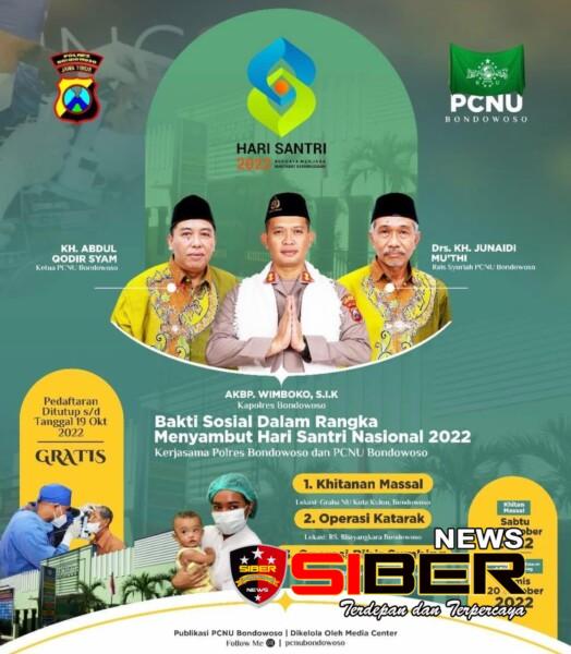 “Maka sebagai wujud syukur kita kepada Allah SWT dan dalam rangka memperingati Hari Santri Nasional tahun 2022 ini, Polres Bondowoso bersama PCNU Kabupaten Bondowoso mengadakan berbagai kegiatan yang dilaksanakan oleh berbagai lembaga dan badan ortonom NU, seperti kegiatan Bakti Sosial dan pelayanan Kesehatan seperti Khitanan Massal, Operasi Bibir Sumbing dan Operasi Katarak, “ujarnya.