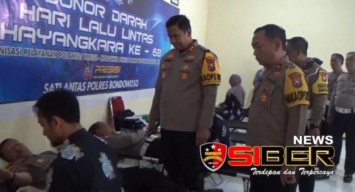 Kapolres Bondowoso AKBP Bimo Ariyanto, SH,S.I.K didampingi Wakapolres Kompol Joes Indra Lana Wira,SH.MH, Kasat Lantas AKP Zainul Imam Syafi’i,SH,MH beserta pejabat utama Polres Bondowoso,memantau langsung kegiatan Donor darah yang mengusung tema, “Donor Darah Hari Lalu Lintas Bhayangkara ke – 68” Modernisasi Pelayanan Polantas Presisi, Mengawal Pemilu Damai Untuk Indonesia Maju.