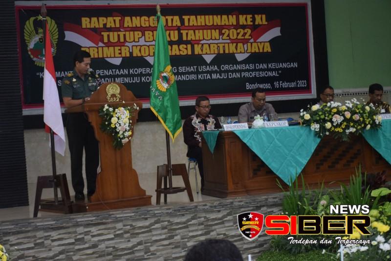 Bondowoso, SIBERNEWS.CO.ID _ Primer Koperasi (Primkopad) Kartika Jaya Kodim 0822 Bondowoso menggelar Rapat Anggota Tahunan (RAT) Primer Koperasi Kartika Jaya Kodim 0822 Tutup Buku Tahun 2022 dengan tema ”Kita Mantapkan Penataan Koperasi Yang Sehat Usaha, Organisasi Dan keuangan Secara Terpadu Menuju Koperasi, Mandiri, Maju Dan Profesional” bertempat di Aula Jenderal Sudirman Kodim setempat Jl. Letnan Sutarman No. 06 Kelurahan Kotakulon, Kecamatan/Kabupaten Bondowoso, Kamis (16/2).