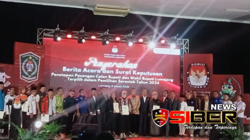 Lumajang, SIBERNEWS.CO.ID – Ketua KPU Lumajang Henariza Febriadmadja (depan kiri) menyerahkan surat keputusan kepada Bupati Lumajang terpilih Indah Amperawati (depan tengah) saat rapat pleno terbuka penetapan Bupati Dan Wakil Bupati Lumajang di Gedung Dr. Sudjono, Lumajang Jawa Timur, Kamis ( 9/1/2025 ).