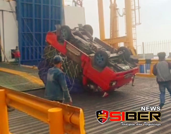 Mobil L300 yang diketahui Berpelat Nomor B 8928 RM yang di kendarai Sarmudi sopirnya saat membawa muatan Pisang terbalik di Dermaga Ekspres Bakauheni pas hendak memasuki kapal.