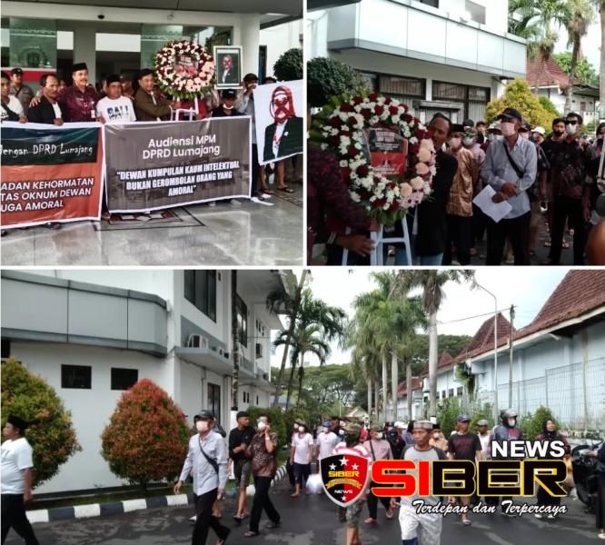 Terlihat puluhan massa mendatangi Kantor DPRD Lumajang dengan mengendarai tiga truk meskipun kondisi hujan. Kemudian, tiga orang perwakilan dari MPM langsung masuk ke kantor dewan dan menyampaikan surat tuntutan aksi damai ke sekretaris dewan.