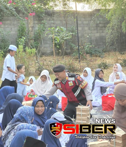 Selain penyaluran bantuan, kegiatan juga diisi dengan momen kebersamaan. Polisi dan anak-anak duduk bersama sambil menikmati santapan yang sudah disediakan. Suasana penuh kekeluargaan terlihat jelas, menumbuhkan semangat kebersamaan dan kepedulian sosial.