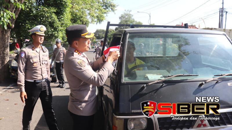 Kapolresta Banyuwangi Kombes Pol Rama Samtama Putra, bersama Wakapolresta AKBP Teguh Priyo Wasono, Kasat Lantas Kompol Elang Prasetyo,S.I.Kom., M.H., dan Anggota Lantas melaksanakan kegiatan pembagian bendera merah putih kepada pengendara yang melintas di jalan tersebut.