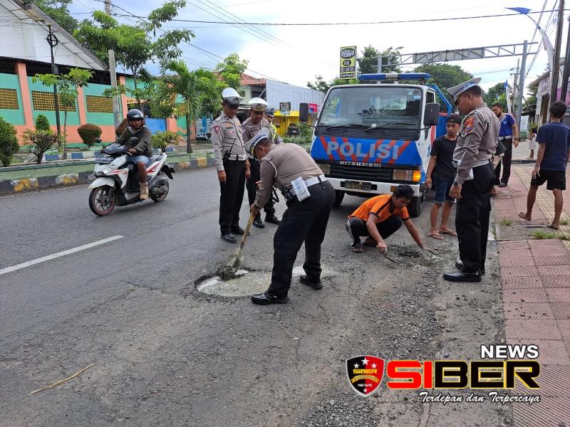 Situbondo, SIBERNEWS.CO.ID _ Untuk mengantisipasi kecelakaan, Anggota Satlantas Polres Situbondo Polda Jatim menambal sejumlah ruas jalan berlubang di Situbondo, Kamis (9/3/2023)