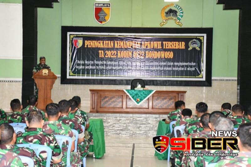 Bondowoso, SIBERNEWS.CO.ID _ Kodim 0822 Bondowoso menggelar Sosialisasi Peningkatan Kemampuan Aparat Komando Kewilayahan Tersebar Tahun Anggaran 2022 dengan tema “Melalui Kegiatan Peningkatan Kemampuan Apkowil Kita Tingkatkan Profesional Apkowil Dalam Mengimplementasikan Kegiatan Pembinaan Teritorial Untuk Membantu Pemerintah Daerah Meningkatkan Ekonomi Kerakyatan Di Wilayah”, yang diikuti oleh Bintara Pembina Desa (Babinsa) jajaran Kodim 0822. Kegiatan dilaksanakan di Aula Jenderal Sudirman Makodim 0822, Jalan Letnan Sutarman No.06, Kabupaten Bondowoso, Jawa Timur, Selasa (11/10/2022).