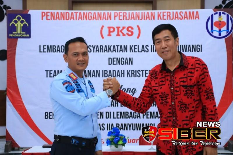 Kerja sama tersebut dibentuk dalam rangka meningkatkan kualitas keimanan dan ketaqwaan WBP Umat Nasrani terhadap Tuhan Yang Maha Esa. Kalapas Banyuwangi, Wahyu Indarto dengan Koordinator Team Pelayanan Ibadah Kristen Banyuwangi, Risky Halim saling menandatangani perjanjian tersebut.