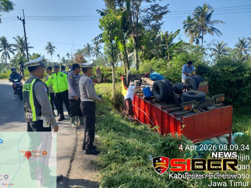 Bondowoso,SIBERNEWS.CO.ID _ Sebuah truk terguling di jalur alternatif Bondowoso-Jember, di desa Grujugan Kidul Kecamatan Grujugan Kabupaem Bondowoso. Truk tak bisa mengendalikan kemudi saat bepapasan dengan motor, di jalur tanjakan berkelok hingga terjun ke sawah.Sabtu,04/04/2026.