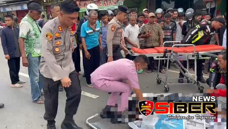 Tampak arus lalu lintas berjalan agak tersendat, dimana mobil dan sepeda motor melambatkan laju kendaraannya untuk melihat korban yang tergeletak ditutupi koran.